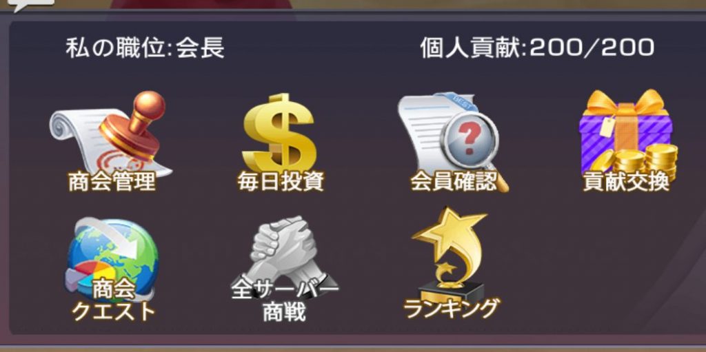 商会では、商会クエストや毎日投資を行うことで、個人貢献ポイントを獲得できます。
