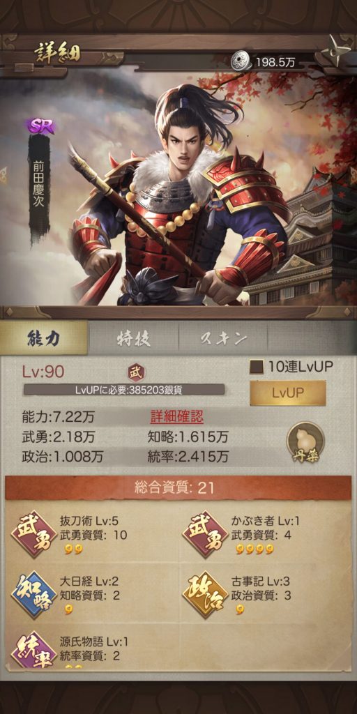 経験値が貯まると、美人特技としてそれぞれ対応する家来の能力が上がります。