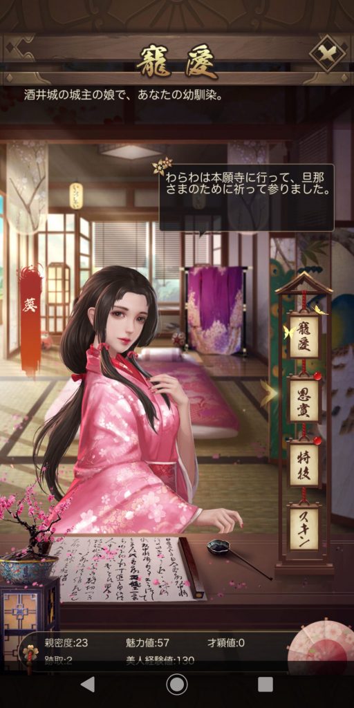 呼び出すことで美人経験値が貯まり、家来の能力に対応する美人特技を伸ばすことも出来ます。
